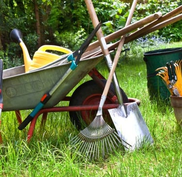 Herramientas, fertilizantes y equipos para mantenimiento de áreas verdes.